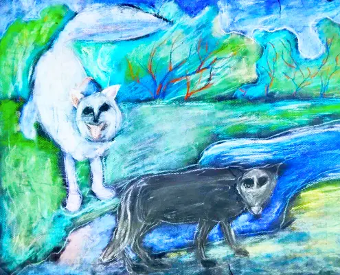Случайная встреча в парке с братьями нашими меньшими. Два друга, два разных характера, как Инь и Янь. Рисунок выполнен на листе формата А3 пастельными карандашами.