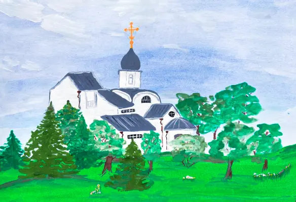 На рисунке я нарисовала храм и икону Божьей Матери Живоносный источник. Храм стоит красивый и большой, у него есть купола и кресты. На небе светит солнце, и всё кажется очень святым и спокойным. Мне очень нравится этот храм, я чувствую тепло и любовь.