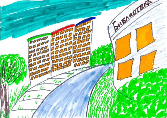 Мы были в библиотеке на мастер-классе, ещё мы заходим туда брать книжки, когда бываем у бабушки. Рядом с библиотекой растёт большая клумба цветов, и недалеко есть детская площадка.
