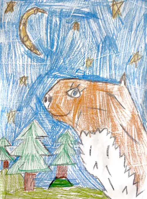 На моём рисунке белочка. Мы часто их видим, когда гуляем в нашем Битцевском парке и кормим орешками и семечками. Белочки забавно прыгают с ветки на ветку и иногда даже берут еду с рук, они забавные и милые.