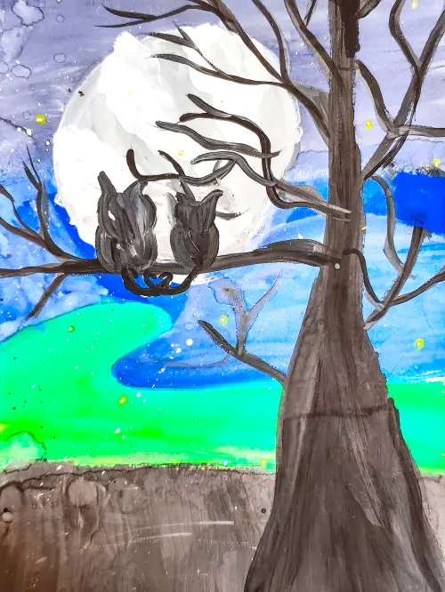Я нарисовал большое дерево во дворе. Осенью с него все листочки падают. И я вижу две птички! Одна — большая, другая — маленькая. Они очень красивые. Я часто смотрю на них, когда иду гулять. Я люблю смотреть, как они прыгают и чирикают. Мне кажется, они ищут вкусные семечки. Это очень интересно!