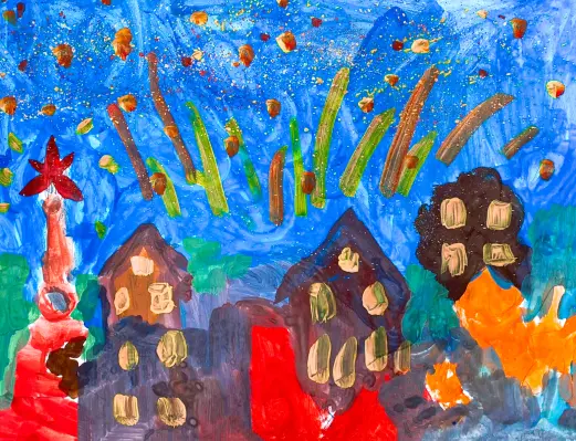 Я нарисовала салют на 9 мая. Мы живем рядом с Поклонной горой и выходим во двор смотреть красивый салют. Это очень красиво. Все вокруг становится волшебным.