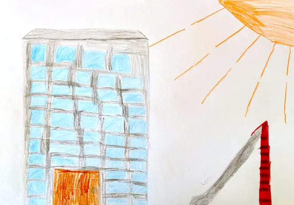 Я нарисовал мой дом. Место, где я вырос. Это место — моё любимое, потому что я всегда живу здесь, и здесь мне хорошо. Картина весёлая и добрая, потому что я так вижу свой дом и своё солнце.