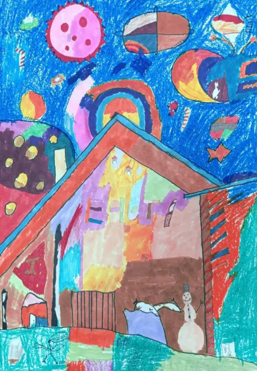 Еву очень вдохновил ночной пейзаж. Она решила пофантазировать и изобразить свой двор ночью. Получилось очень образно и ярко. Как будто в небе над домом прошел парад планет.