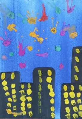 На моём рисунке изображён волшебный момент — ночной салют, который раскрашивает тёмное небо в яркие, праздничные цвета. В центре композиции взлетают разноцветные огни, рассыпаясь в воздухе, словно волшебные звёздочки, которые внезапно появляются из темноты.