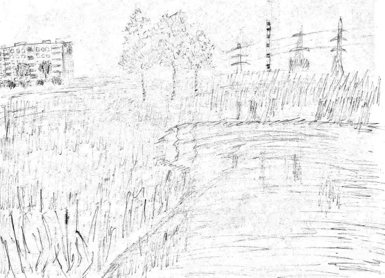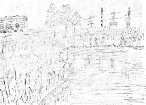 Солнечный свет мягко льётся на просторную поляну. Небольшое озеро, сверкая на солнце, отражает кучевые облака. Вода чистая, у берегов видны зелёные водоросли. На горизонте, за полосой молодых деревьев, виднеются новостройки. На создание этой работы меня вдохновила одна из старых фотографий района Гольяново.