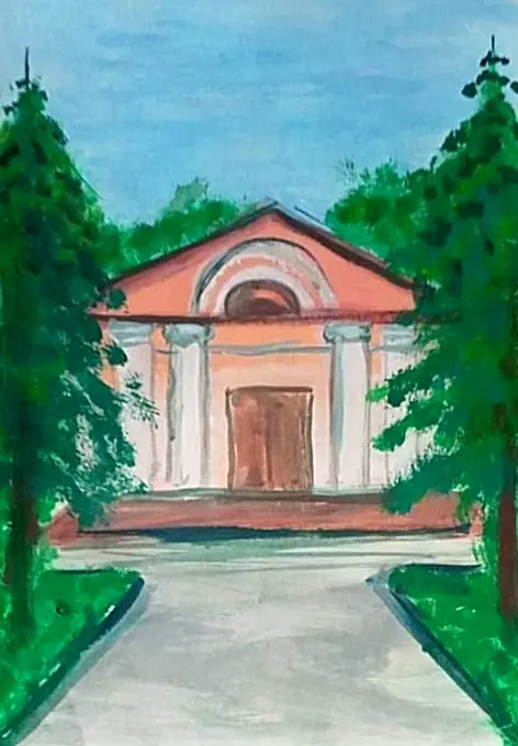 Мне очень понравилось историческое здание культурного центра и его месторасположение среди вечнозелёных елей. Именно это вдохновило меня на создание картины.