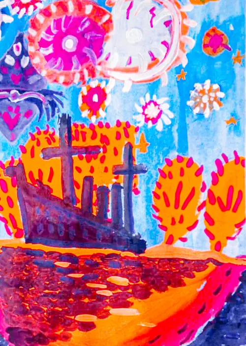 На рисунке изображён День города Москвы - праздничный салют, отражение фейерверков в воде, яркая листва деревьев. Мне нравится смотреть праздничный салют на улице.