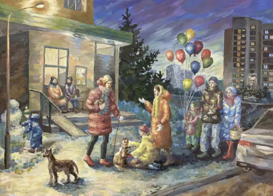 Если внимательно присмотреться к работе, то можно увидеть множество прорисованных деталей. Как досконально прорисованы люди, их одежда, животные, дома.
