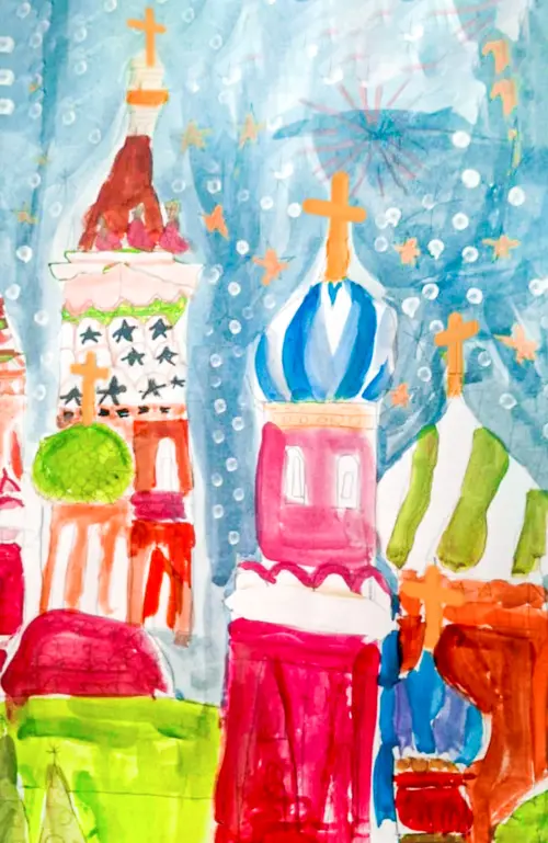 На рисунке изображен Храм Василия Блаженного, который находится на Красной площади в Москве. Пушистые снежинки легко и невесомо касаются куполов храма, и кружась летят вниз.