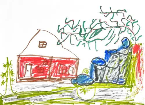 На рисунке я нарисовал задний двор нашей дачи. Он очень большой и там есть много всего. Мое любимое место - это прудик возле дома. Там я могу смотреть за рыбками и кормить их.