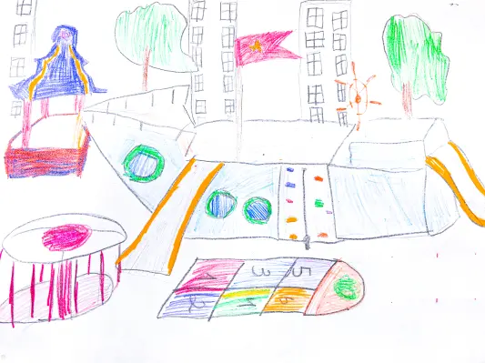 На рисунке площадка во дворе нашего дома, на которой я очень люблю гулять со своими друзьями. В центре площадки находится большой корабль с канатами и горками.