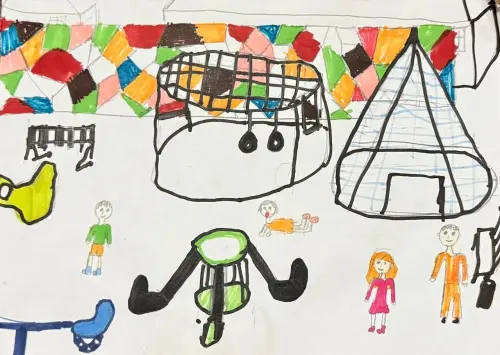 На этом детском рисунке изображена моя любимая площадка. В центре картины расположена яркая качель, на которой сидит улыбающийся ребенок. Рядом — яркий горка с красной и жёлтой окраской, по которой дети спускаются весело и быстро. Вокруг расположены разноцветные качели, на которых качаются другие ребята. На заднем плане видны высокие деревья с зелёной листвой, создающие приятную тень и уютную атмосферу. В небе светит солнце, а вокруг — цветочные клумбы и травяные лужайки, наполняющие рисунок радостными красками и ощущением беззаботного детства.