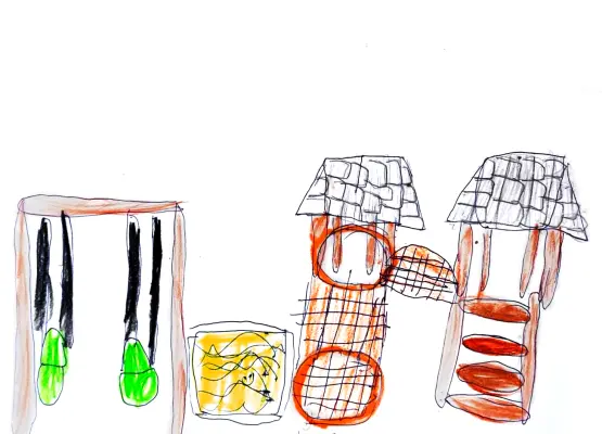 Ева любит гулять. В своей работе она нарисовала свой двор, и всё, что есть во дворе для интересной прогулки и отдыха детей. Качели, песочница и многое другое, всё это девочка постаралась подробно передать в своём рисунке.