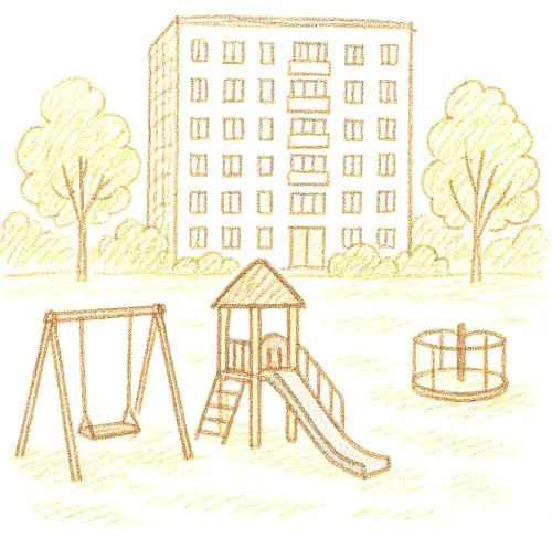Дом, в котором я живу, украшает мою улицу, дом большой с красивыми балконами, вокруг него много красивых деревьев и кустарников, из окна своей комнаты видна детская площадка, я люблю кататься на качелях и горке.
