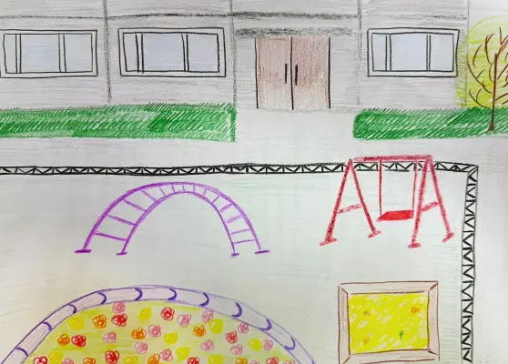 На рисунке я нарисовала двор многоквартирного дома, в котором живут много детей. Во дворе они играют, общаются с друзьями, площадки, качели, песочница, деревья, подвижные игры, лето, пейзаж, красота, игры, общение, детские рисунки, двор, веселье, смех, уют деревья. К сожалению листок не большой и не влезло все, что мне хотелось отобразить. Но даже на таком небольшом пространстве мне кажется удалось показать беззаботное летнее настроение детей, живущих в этом доме.
