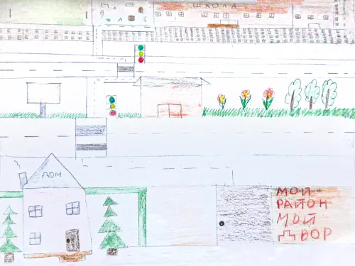 В своём рисунке я изобразил дом, где я проживаю, магазин, куда обычно ходим с мамой за продуктами и путь к моей школе в моём любимом районе, где я живу. Я проживаю в Можайском районе города Москвы, каждый день, идя в школу, я прохожу два пешеходных перехода со светофорами, движение очень активное, и нужно всегда быть предельно внимательным. У нас в районе есть много детских и спортивных площадок, где я обычно играю со своими друзьями. Я люблю свой район и хочу, чтобы он становился с каждым годом всё краше и лучше!