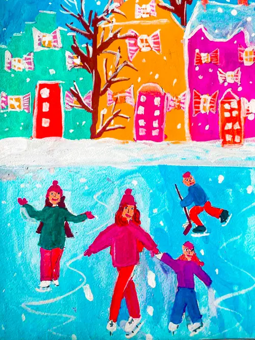 Рисунок «Каток» словно переносит нас в зимнюю сказку. На льду, искрящемся под лучами солнца, резвятся дети и взрослые. Кажется, что смех и радость наполняют морозный воздух.