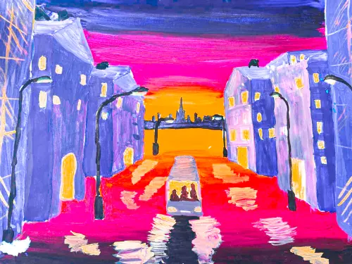 Это не просто изображение, это запечатленный момент тишины и красоты в сердце шумного мегаполиса. Художник, словно волшебник, уловил ту неуловимую грань, когда день уступает место ночи, а город преображается в золотом сиянии заходящего солнца.