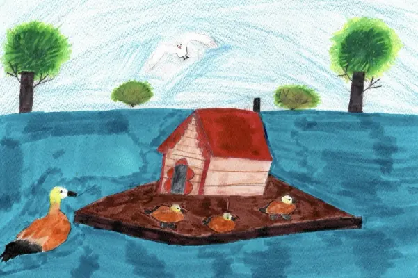 На рисунке представлен Дом уточек — небольшое деревянное сооружение, расположенное в живописном уголке Воронцовского парка рядом с водоемом. Вокруг дома видны уточки, плавающие на воде.
