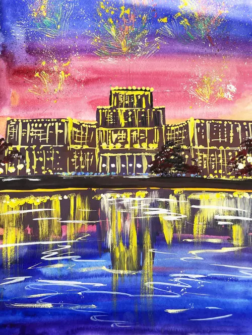 На этом рисунке запечатлена волшебная атмосфера праздничной Москвы. Ночное небо расцвечено яркими огнями салюта, превращая столицу в сказочный город. Кажется, что каждая искра фейерверка отражается в сияющих куполах соборов и величественных зданиях, создавая неповторимую игру света и тени.