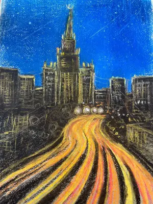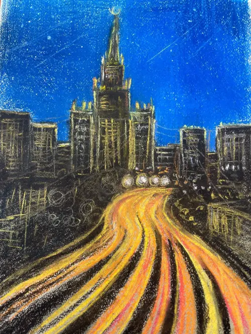 На этом рисунке запечатлена вечерняя Москва, погруженная в таинственную ночную атмосферу. Город, никогда не спящий, предстает перед нами во всем своем великолепии, усыпанный россыпью огней.