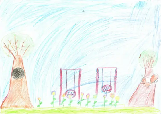 В нашем парке рядом с домом поставили большие деревянные качели. Мы с мамой очень любим на них качаться. Парк у нас очень красивый, иногда встречаем белочек.