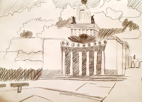 На рисунке изображён величественный главный корпус ВДНХ. Его архитектура — сочетание классических и советских стилей, с колоннами и куполами. Этот рисунок передаёт дух эпохи и гордость достижения науки и техники.