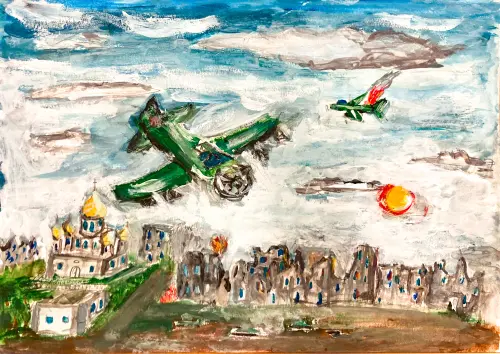 Над нашим районом часто летают вертолёты и самолёты. Это вдохновило меня нарисовать такой рисунок, но я решил посвятить его Великой Отечественной войне, и, главное, лётчикам - героям.