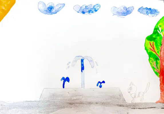 Я нарисовала фонтан на бульваре Карбышева в нашем районе. Я люблю гулять там с мамой, потому что часто вижу там котов и кошек. У моей мамы аллергия, поэтому я люблю все места в нашем районе, куда приходят коты и кошки.
