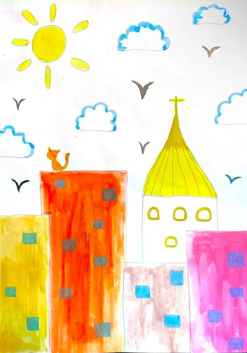 Володя - ребёнок-инвалид. Он любит сидеть у окна и наблюдать за жизнью любимого города. На этом рисунке он запечатлел лето в Москве. Солнце уже высоко, оно отражается в крышах соседних зданий и на куполе церкви...