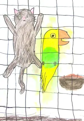Ребята часто рисуют, вспоминая собственные наблюдения и интересные истории. Лёня Войтенко увидел в парке Трубецких нового попугая, который поселился в птичник. В тот момент его заметил местный кот и попытался залезть к нему по решетке клетки.
