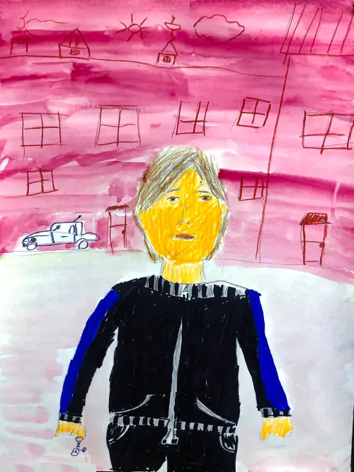 Илья сделал автопортрет на фоне улицы, где он часто бывает. Это широкий и красивый Комсомольский проспект в районе Хамовники. Использовал карандаши, акварель и фломастеры.