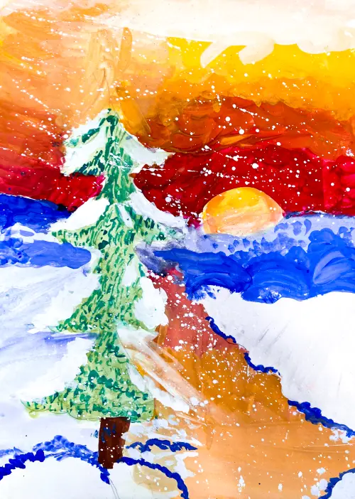 Мне нравится гулять зимой. Потому на занятиях по рисованию, когда задали свободную тему, я сразу выбрала зиму. Это самое красивое время года. И особенно красиво, когда яркое солнце и красное небо. Люблю яркие цвета.