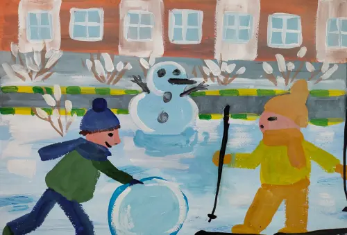 В солнечный зимний день ребята играют в нашем дворе: катаются на лыжах, лепят снеговиков и радуются пушистому снегу, который подарил им столько интересных забав. Гуашь.
