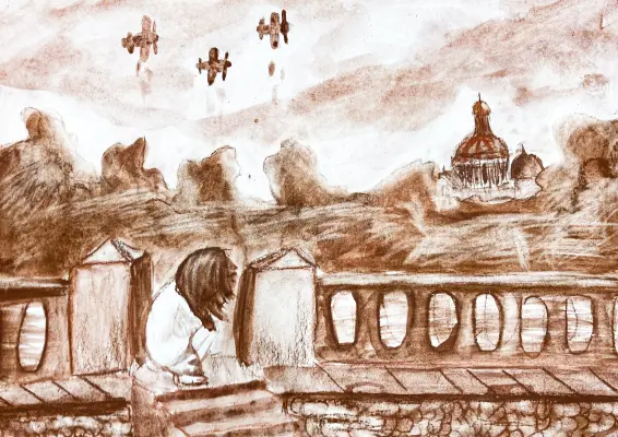 Мне очень нравятся пейзажные мотивы и особенно в графических техниках. Выполнять такие рисунки очень увлекательно, можно показывать разную фактуру, передавать различное настроение и при этом не использовать много цветов. На занятии по рисованию нам задали тему Великой Отечественной войны. Особенно трагично эта тема раскрывается, когда сквозь дым проглядывает прекрасная архитектура - творение человека.
