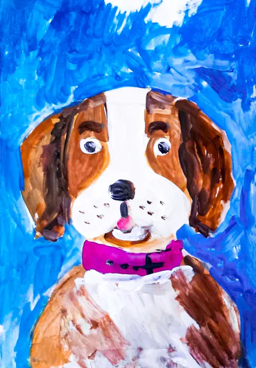 Это рисунок морды собаки! Она такая милая, с большими карими глазами и пушистыми бровками. Носик чёрный, мокрый, как будто настоящий. Ушки висят, как у лабрадора. Так и хочется её потрогать! Рисовал гуашью, старался, чтобы было похоже.