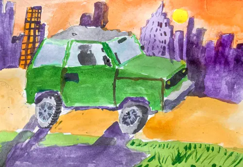 Я рисую не так давно. Но на занятиях у меня получается нарисовать так, как я задумал. Я решил нарисовать машину, и для красоты выбрал вечерний город.