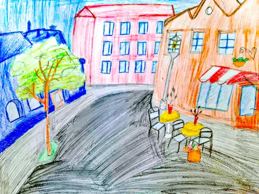 На рисунке я нарисовала свой двор, где мы проживаем со своей семьёй. Мне он очень нравится. Здесь есть детская площадка, много цветов и просто зелени. Есть ещё спортивная площадка. Мы очень любим играться в нашем дворе.