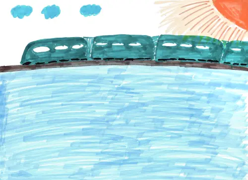 Мы ездили к бабушке и дедушке. Мне очень понравилось ехать и смотреть в окно на Москву-реку и город. На рисунке изображен поезд, который едет по метромосту через Москва-реку.