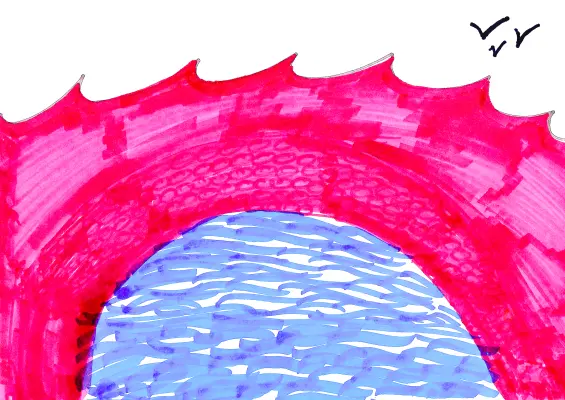 Мы гуляли по парку «Царицыно», катались на электромобиле, потом пошли пешком и по мостику прошли на берег, с которого лучше всего видно арку Русалочьего острова. На рисунке нарисован мостик из красного кирпича.