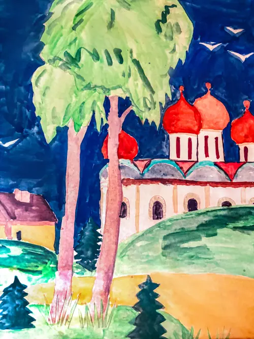 Летний пейзаж, на фоне деревьев открывается вид на храм. Тёплое летнее утро в Хамовниках.