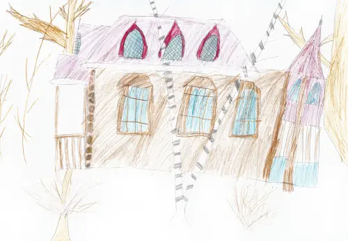 Перед нами предстаёт живописный уголок природы, где гармонично переплетаются величие леса и уют человеческого жилища. В центре композиции расположился небольшой домик, словно спрятавшийся среди густой зелени. Хочется вдохнуть аромат свежескошенной травы, укрыться в тени берёзы и насладиться тишиной лесного уголка.