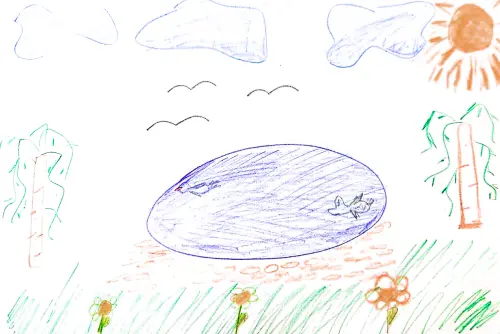 На рисунке изображены уточки, которые плавают в пруду. Этот пруд находится рядом с моим домом. У уточен есть свой домик, он там живут. Иногда они выходят на травку погулять.