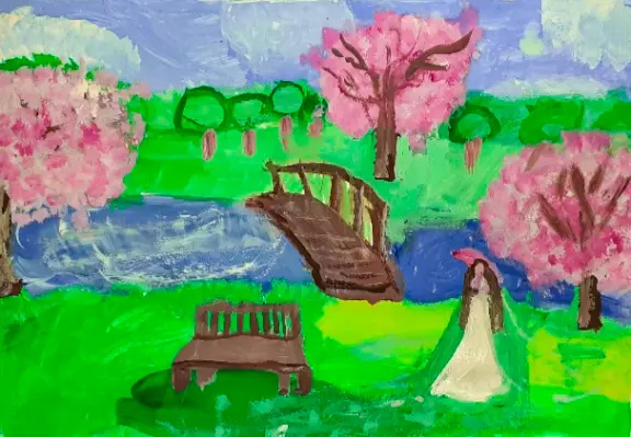 Я нарисовала цветущую весну в Терлецком парке и невесту. Многие молодожёны любят отмечать свою свадьбу в парке, на природе. Здесь очень красиво и умиротворённо.