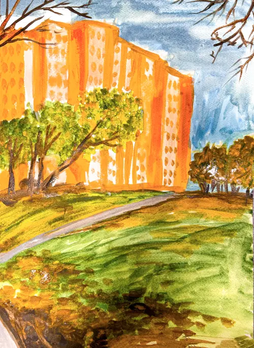 Мой район Очаково-Матвеевское не наполнен старыми архитектурными сооружениями, но все же наши уютные дворы нам дороги. Дома у нас в районе разные, но мне больше всего нравятся оранжевые, они яркие и красивые.