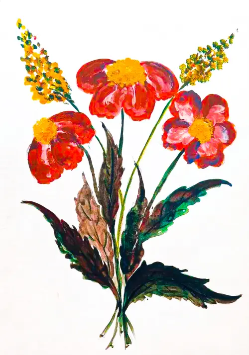 Этот букет я нарисовала, потому что люблю природу в нашем Басманном районе. Весной и летом здесь расцветают красивые цветы, и я часто собираю их в парке или возле Яузы. Мне нравится дарить рисунки с цветами своим близким, ведь в них — красота моего района.
