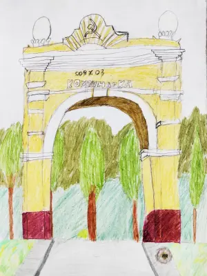Арка совхоза «Коммунарка» - одно из главных архитектурных украшений нашего молодого района. Среди новостроек и современного дизайна это островок прошлого. Арка была построена в 1949 году при въезде в совхоз. В 1980 году была демонтирована после того, как её задел поезд. И только в 2017 году арку воссоздали по эскизам. Теперь она украшает наш район при входе в липовый парк. Работа выполнена с натуры.
