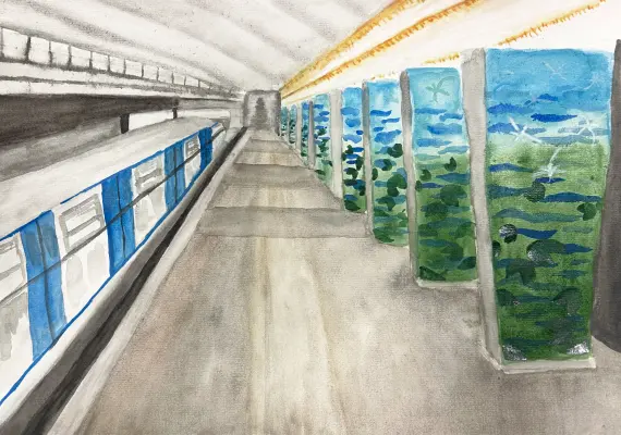 Станция метро Озерная расположилась на границе нескольких районов на западе Москвы. Я этой станцией часто пользуюсь, так как живу недалеко. А какая она красивая. На ней изображены кувшинки и веет летней приятной прохладой.