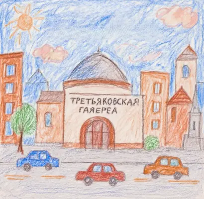 Яркий и непосредственный рисунок изображает главный музей русского искусства - Третьяковскую галерею. Здание показано крупно, занимая центральную часть листа. Его фасад украшают характерные колонны и арочные окна, которые ребенок изобразил схематично, но узнаваемо. Крыша нарисована насыщенным красным цветом, создавая праздничное настроение.